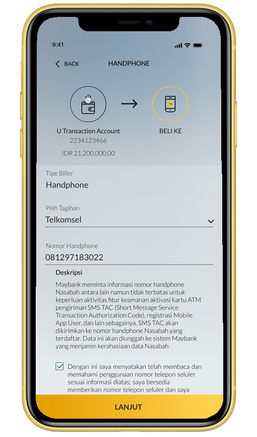 Klik pilihan tagihan serta masukkan ‘Nomor Handphone’ yang dituju lalu centang box pernyataan dibawah |