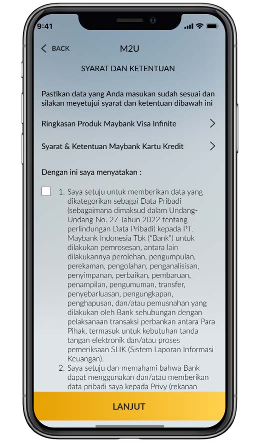 Baca dan setujui syarat dan ketentuan, Klik “Lanjut”