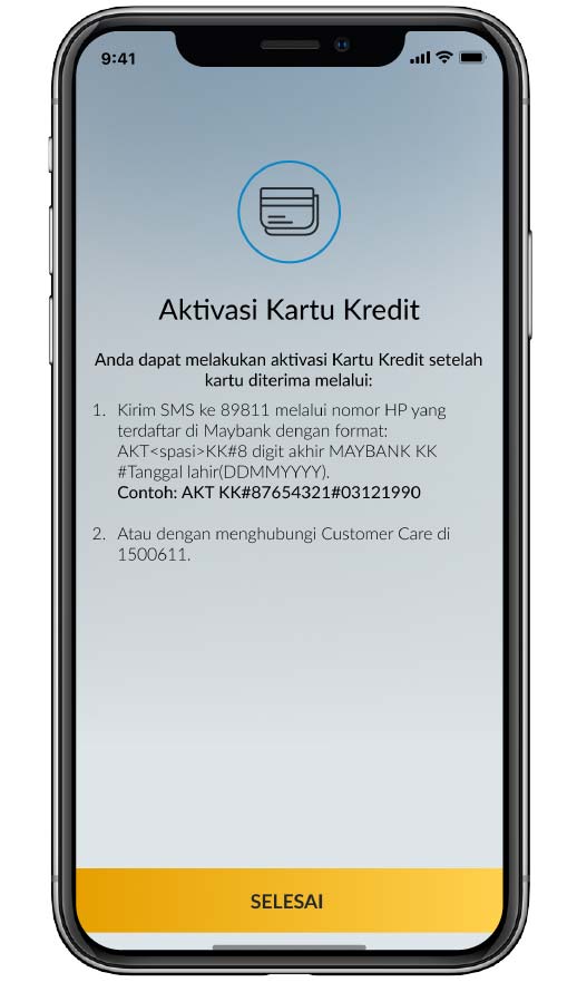 *Aktivasi via M2U ID App dapat dilakukan khusus untuk Maybank Kartu Kredit berlogo Mastercard® atau VISA. Untuk Maybank Kartu Kredit JCB, lakukan aktivasi melalui SMS ke 89811 atau menghubungi Maybank Customer Care. Selengkapnya www.maybank.co.id/aktivasikk