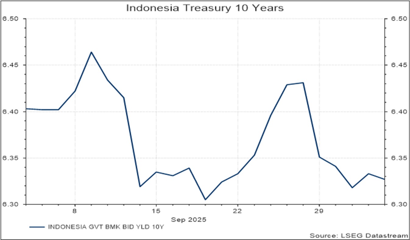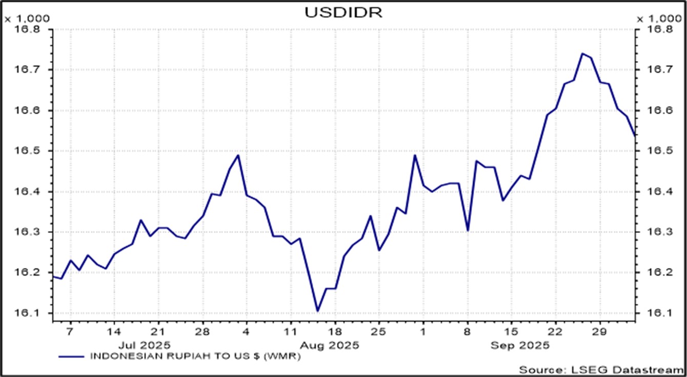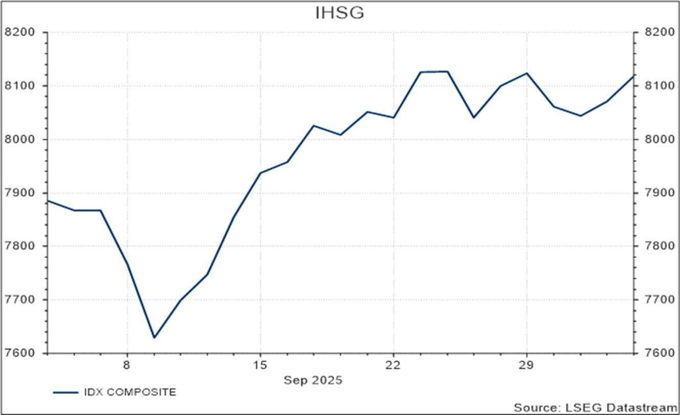 Indonesia merilis data inflasi tahunan yang lebih tinggi dari perkiraan, mencapai level tertinggi sejak Mei 2024, didorong oleh kenaikan harga pangan. Meski demikian, inflasi ini masih berada dalam kisaran target Bank Indonesia (BI). Di sisi lain, surplus neraca perdagangan melebar ke level tertinggi sejak Oktober 2022, seiring dengan kenaikan ekspor dan penurunan impor.