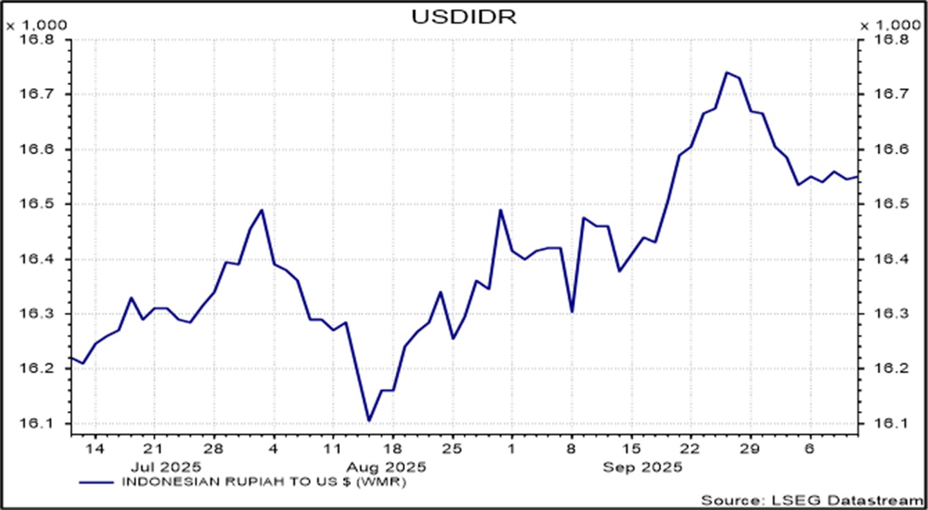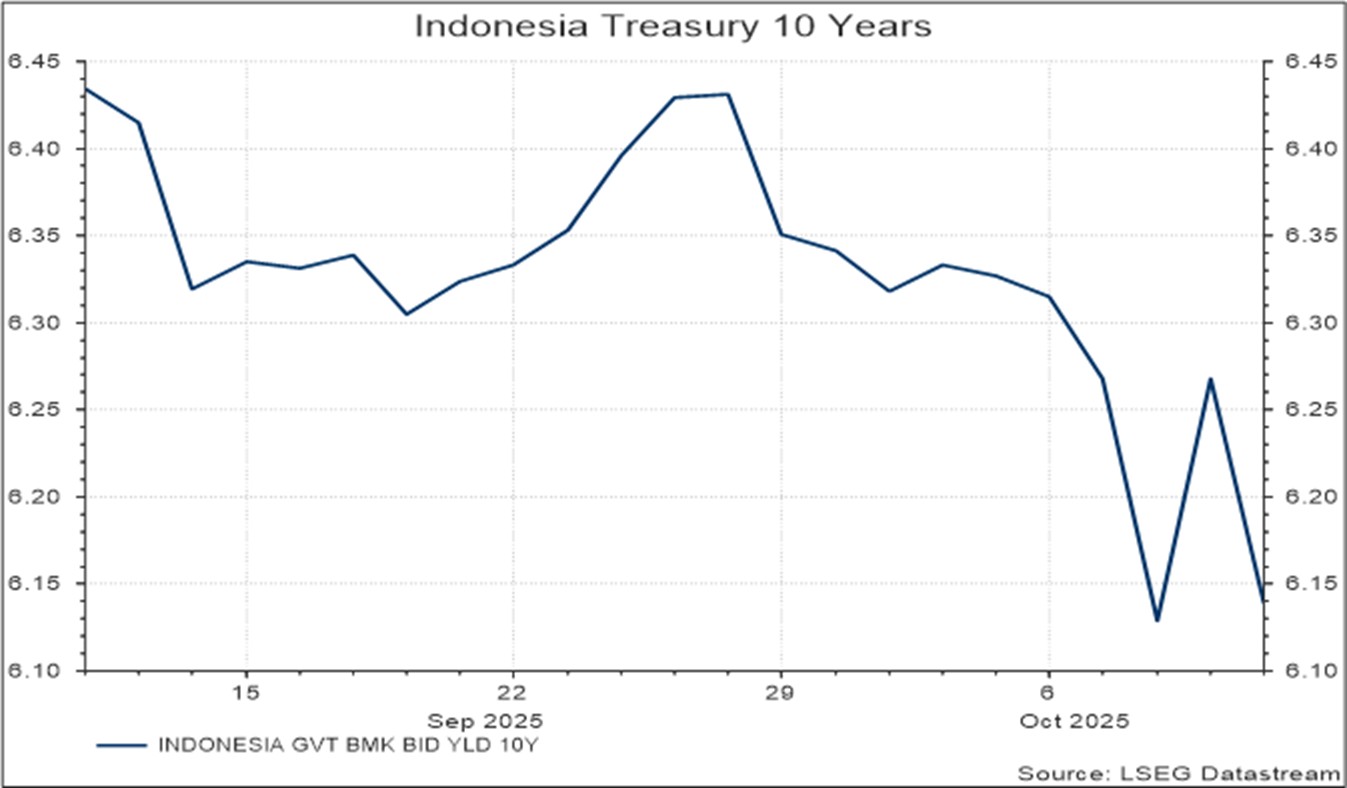 Cadangan devisa Indonesia menurun, terutama akibat pembayaran utang luar negeri dan intervensi Bank Indonesia untuk menstabilkan nilai tukar rupiah, yang sepanjang minggu ini relatif stabil di kisaran (Rp16.500,-) – (Rp16.600,-) per dolar AS. Di pasar obligasi, imbal hasil ID10Y turun tajam sebesar 20 basis poin menjadi 6,11%, sementara tenor 2 tahun turun lebih moderat menjadi 4,91%. Tren penurunan ini mencerminkan ekspektasi pemangkasan suku bunga BI yang diperkirakan mencapai 4% pada kuartal pertama 2026. Dengan ekspektasi pelonggaran global dan penurunan premi jangka panjang, terdapat ruang lebih besar bagi penurunan yield di tenor panjang. Dalam konteks ini, strategi penambahan durasi dinilai optimal untuk meningkatkan imbal hasil, terutama melalui instrumen obligasi pemerintah berjangka panjang.
