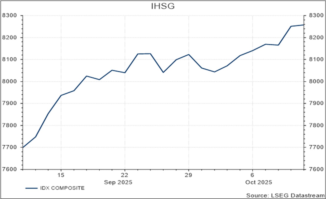Pemerintah AS masih mengalami penutupan sebagian (government shutdown) yang kini telah melampaui rata-rata durasi historis delapan hari, meski belum mencapai rekor 35 hari pada masa pemerintahan sebelumnya. Meskipun belum ada kemajuan berarti menuju resolusi, pasar saham AS relatif stabil dan bahkan mencatat kenaikan selama periode penutupan ini. Keterbatasan data resmi akibat penghentian operasional lembaga pemerintah masih berlangsung, namun pelaku pasar tetap memperkirakan adanya dua kali pemangkasan suku bunga hingga akhir tahun. Indeks Dolar AS (DXY) menguat ke level 99,33 dari 97,78 pada akhir September, didorong oleh pelemahan mata uang utama lain seperti euro dan yen yang tertekan oleh melemahnya prospek pertumbuhan di Eropa dan ekspektasi pelonggaran kebijakan di Jepang.