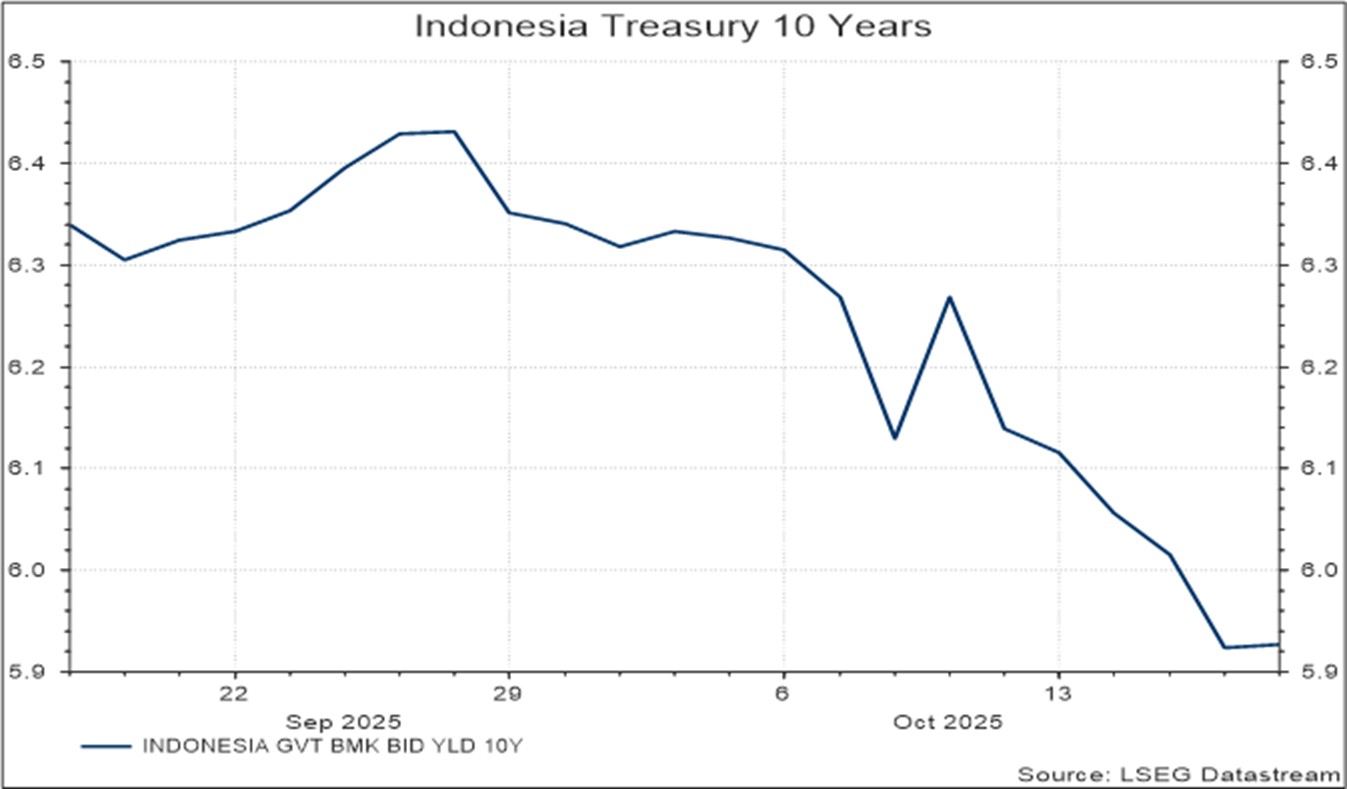 Foreign Direct Investment (FDI) Indonesia menurun tajam secara tahunan, menjadi penurunan terdalam sejak kuartal I-2020. Pelemahan ini sebagian disebabkan oleh kebijakan perdagangan AS serta menurunnya daya beli domestik. Di pasar obligasi, imbal hasil INDON 10 tahun turun 9 bps sepanjang bulan, lebih kecil dibanding penurunan signifikan IndoGB 10 tahun yang mencapai 40 bps dan untuk pertama kalinya sejak Januari 2021 turun di bawah level 6%.
