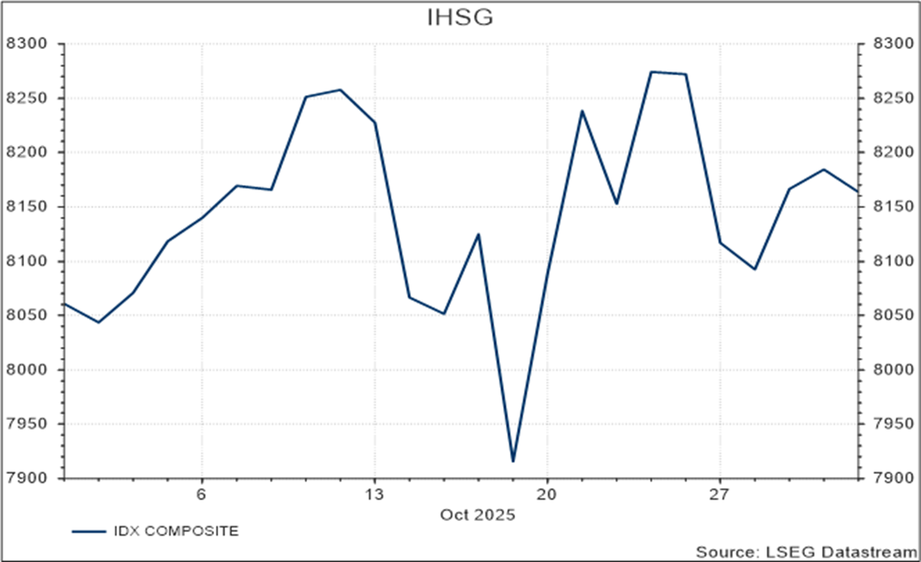 Pemerintah AS masih mengalami penutupan sebagian (government shutdown) yang kini memasuki bulan kedua, dan berpotensi melampaui rekor terlama sepanjang sejarah yang terjadi pada akhir 2018 hingga awal 2019 selama 35 hari. Namun, fokus utama pasar minggu ini tertuju pada hasil rapat FOMC, di mana The Fed kembali memangkas suku bunga seperti yang telah diperkirakan pasar. Kejutan muncul dari pernyataan Ketua The Fed, Jerome Powell, yang menekankan ketidakpastian terhadap kemungkinan adanya pemangkasan lanjutan pada Desember mendatang.