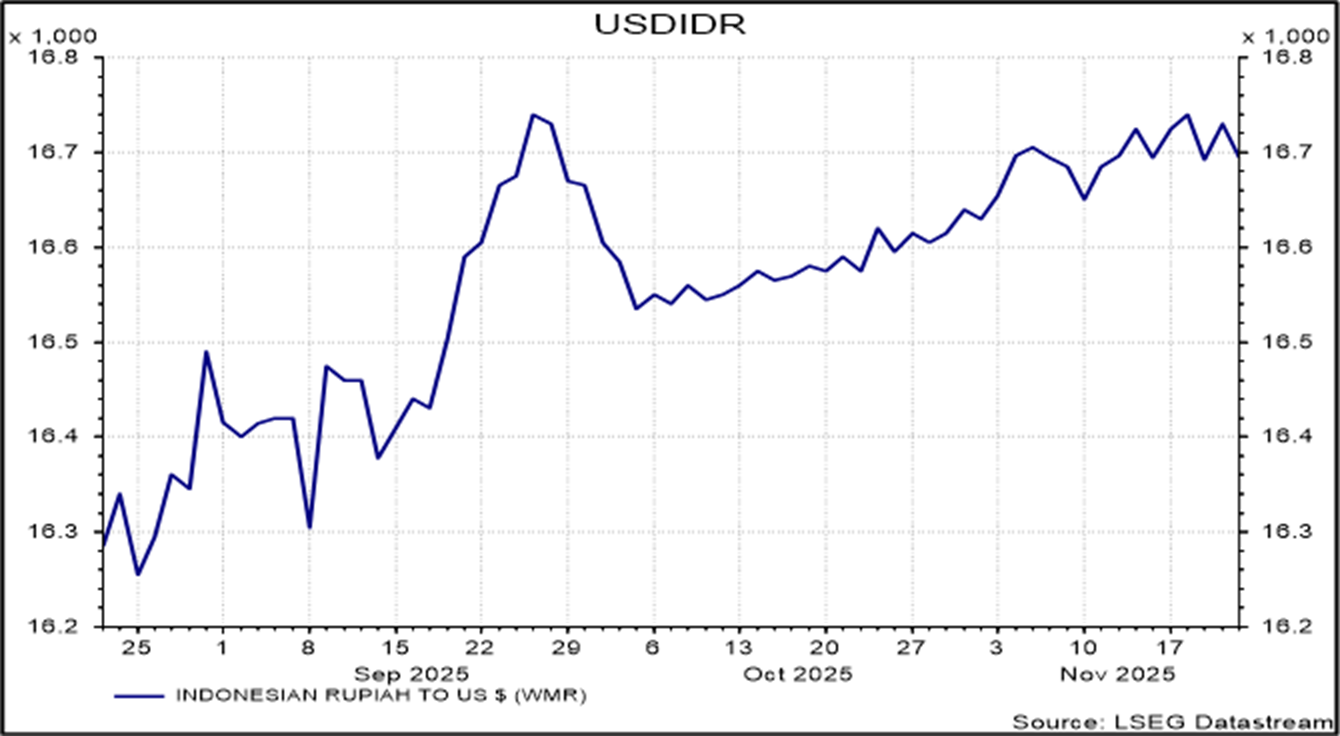 Bank Indonesia menahan suku bunga acuan di 4,75%, sesuai ekspektasi, dengan fokus utama menjaga stabilitas Rupiah yang cenderung lemah namun stabil di sekitar Rp16.700 ribu dalam satu bulan terakhir. Meskipun demikian, BI tetap memantau efektivitas transmisi penurunan suku bunga ke suku bunga kredit yang masih berjalan lambat.