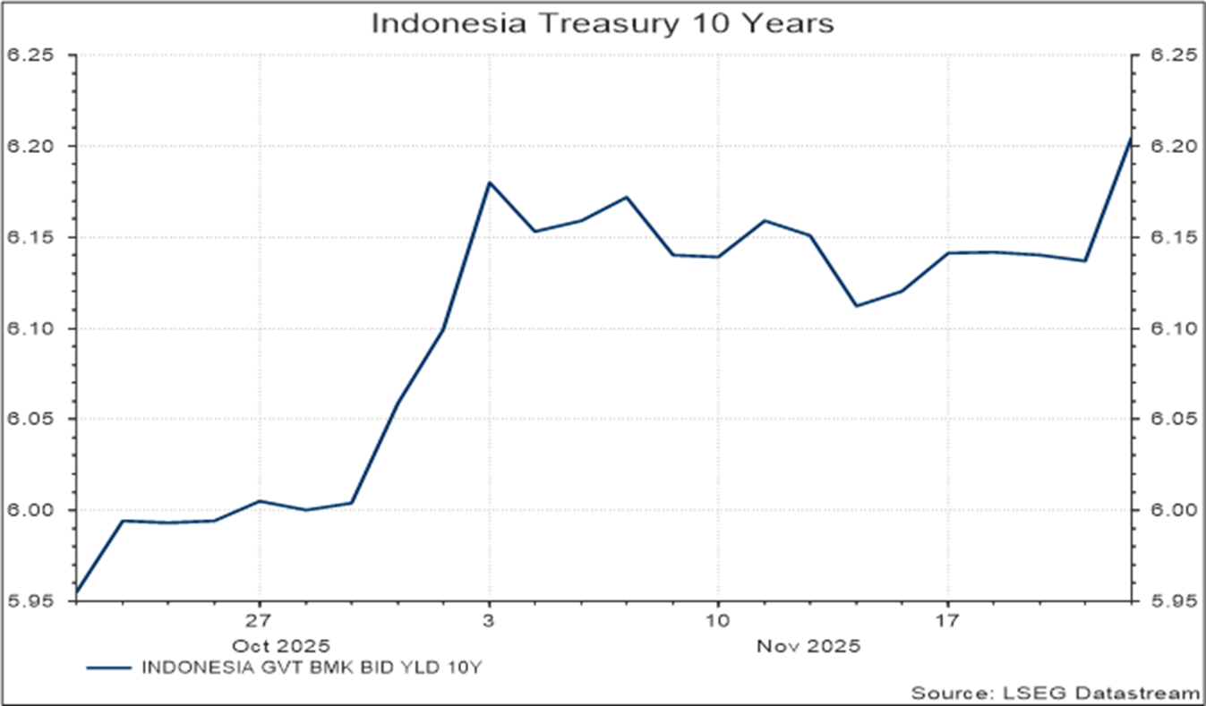 Data ketenagakerjaan AS minggu ini menunjukkan sinyal yang bercampur. Tingkat pengangguran naik ke level tertinggi sejak Oktober 2021, mencapai 4,3% dan meleset dari ekspektasi pasar. Namun, Non-Farm Payrolls justru mencatat pertumbuhan terkuat dalam lima bulan terakhir dan melampaui konsensus, menandakan ketahanan pasar tenaga kerja. Dari sisi pasar keuangan, volatilitas masih tinggi meskipun laporan laba NVIDIA yang lebih baik dari ekspektasi sempat mendorong kenaikan indeks saham AS. Kekhawatiran atas valuasi saham-saham bertema AI tetap membebani sentimen. Di sisi kebijakan, data tenaga kerja yang beragam turut menekan ekspektasi pemangkasan suku bunga The Fed pada pertemuan Desember. Probabilitas pemangkasan kini turun ke sekitar 30%, dan proyeksi Fed Funds Rate akhir tahun bergerak naik dari 3,6% menjadi 3,8%. Meskipun demikian, pasar tetap melihat bahwa tren penurunan suku bunga dalam jangka menengah masih solid, tercermin dari turunnya yield UST 10Y ke 4,05% dan yield 2Y ke 3,5%.