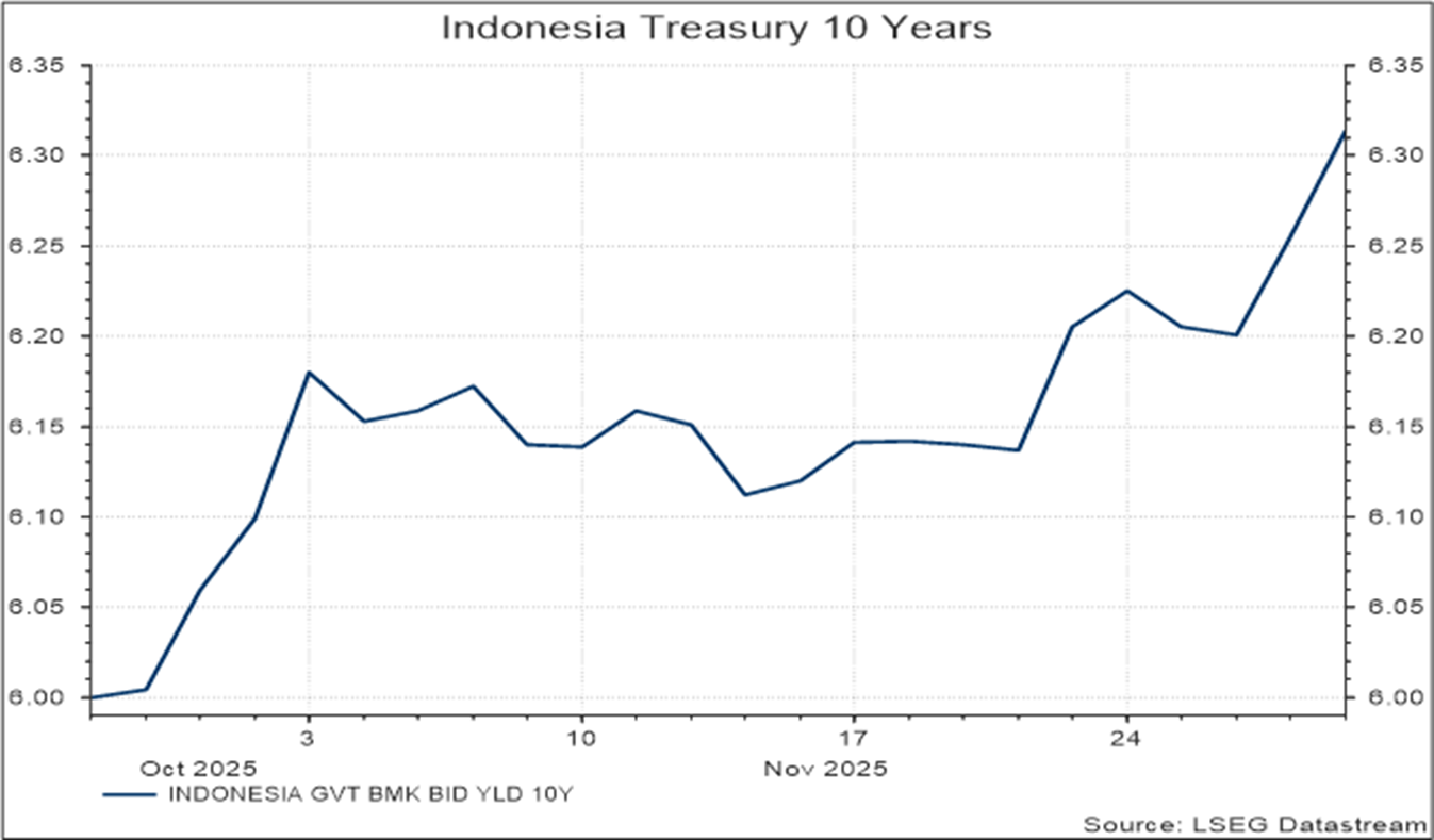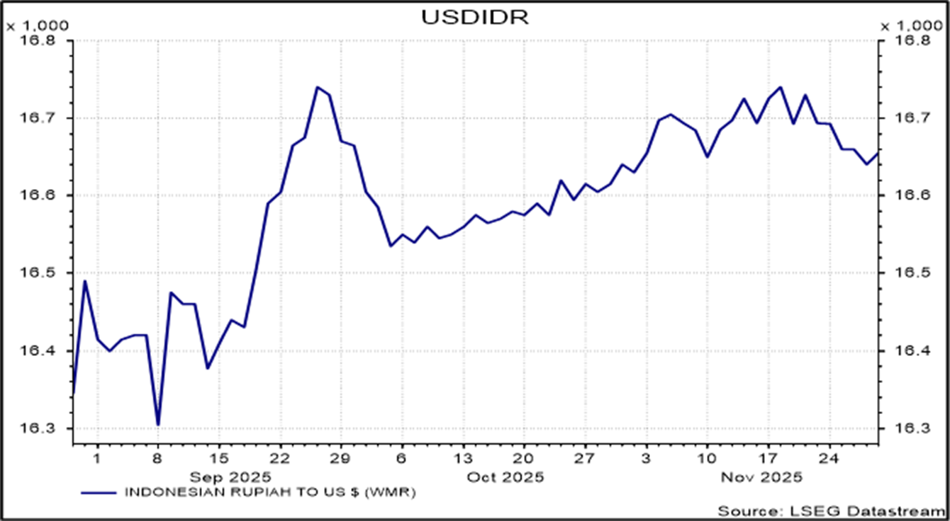 Inflasi Indonesia melambat seiring kenaikan harga pangan yang lebih moderat, namun tetap berada dalam kisaran target Bank Indonesia. Kondisi ini memberikan ruang tambahan bagi BI untuk mempertimbangkan langkah kebijakan berikutnya, terutama menunggu keputusan The Fed minggu depan sebelum menentukan arah suku bunga pada pertemuan BI setelahnya. Stabilitas Rupiah tetap menjadi perhatian utama, sementara transmisi penurunan suku bunga sebelumnya terhadap suku bunga kredit masih belum optimal.