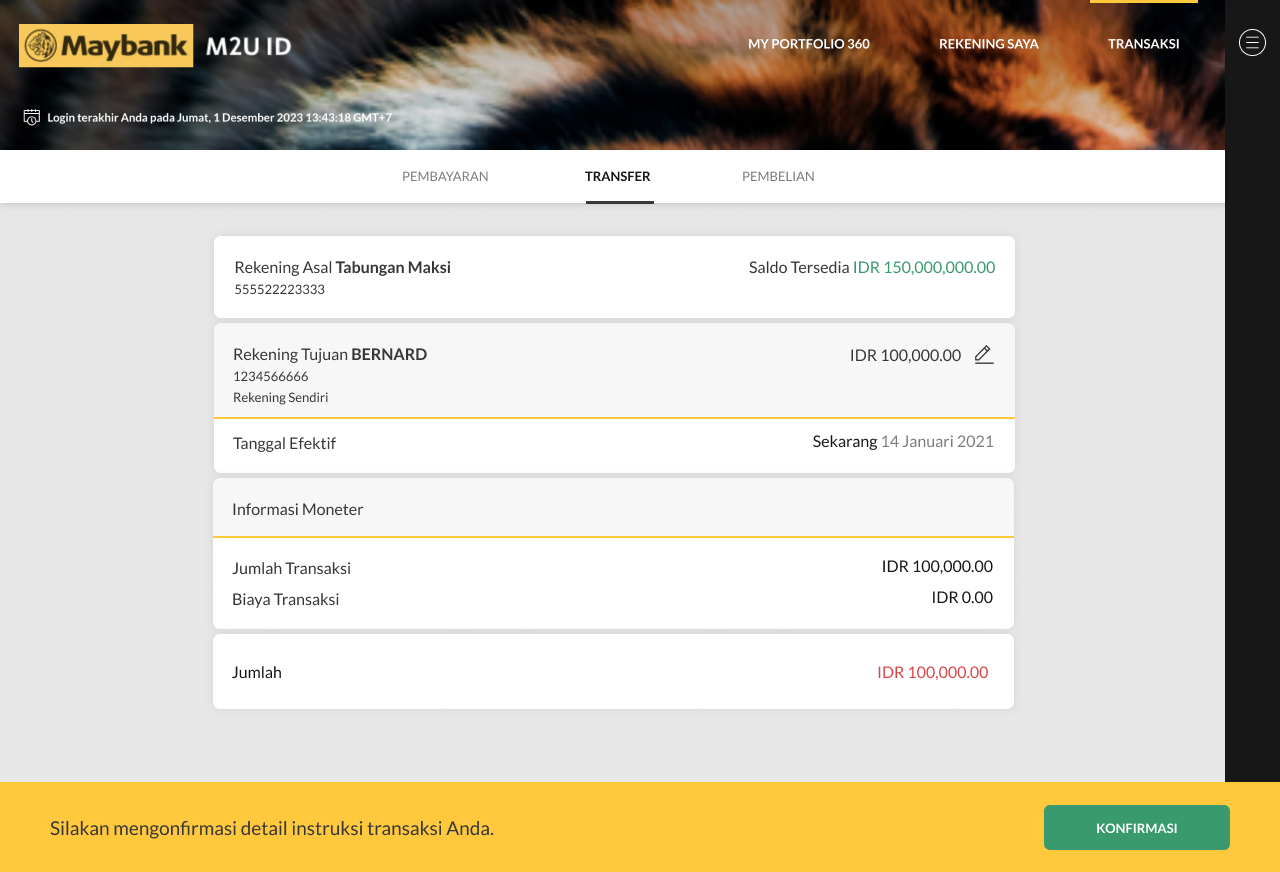 Enter the currency and transfer amount, then click the 'Transfer' button.