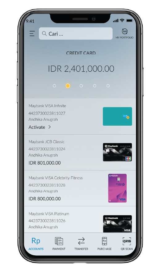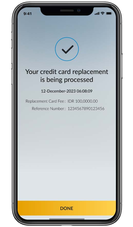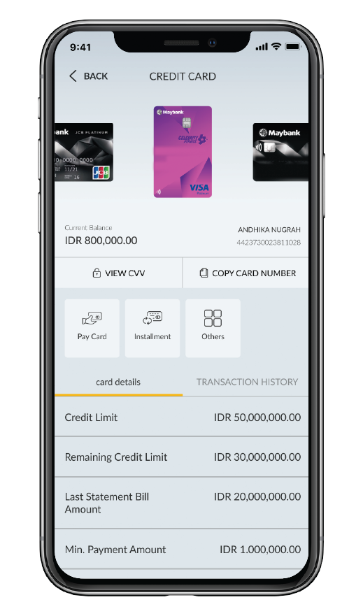 On the account dashboard, swipe left to the credit card dashboard, and Select the credit card you want to request for card replacement *Credit Card Replacement can also be accessed via the burger menu and select card management
