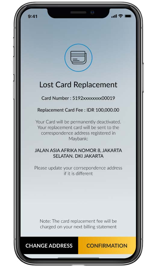 Check the information of card number & card delivery address. Then click "CONFIRM" *Card replacement fee is IDR 100
