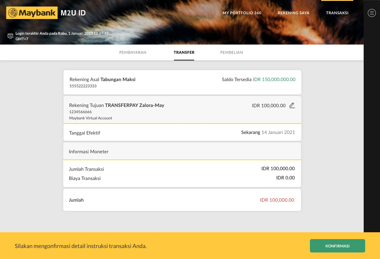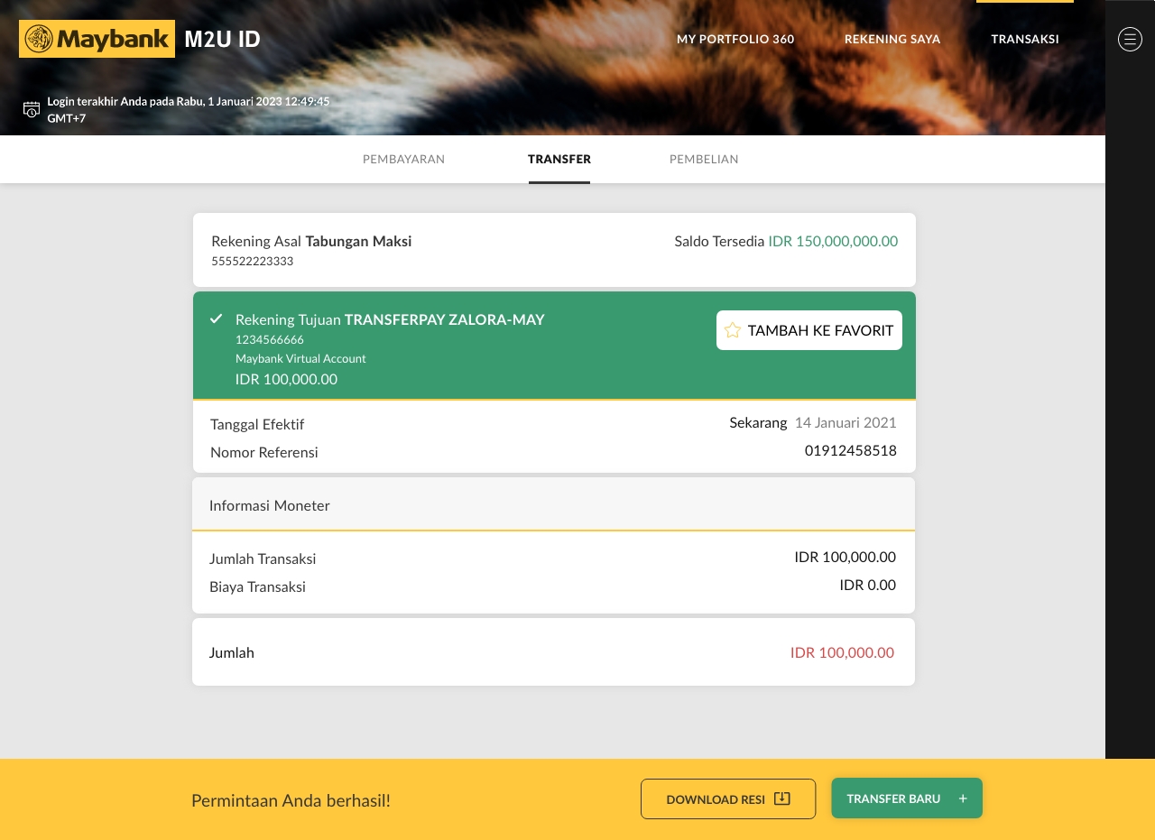 Enter Maybank Virtual Account number and nominal payment, then click “Transfer”