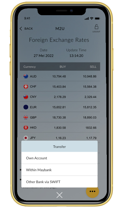 Login M2U ID App, click the menu icon on the upper left of Your account screen, choose Foreign Exchange (to see the updated foreign exchange) |
