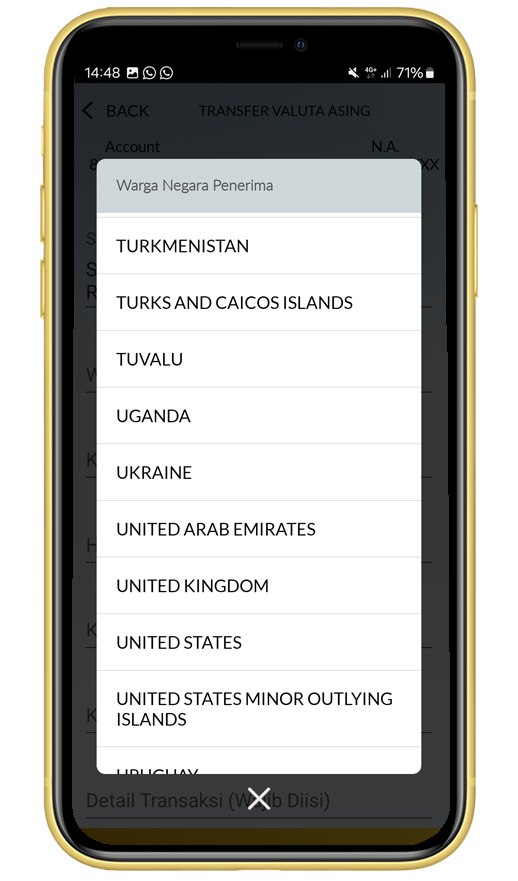 Input Your transaction purpose and underlying document type*. If Your foreign exchange transfer do not exceed USD100,000, choose “Without Underlying” An underlying document is required for IDR-CNY transfers in any amount, to any bank located or branched in Mainland China