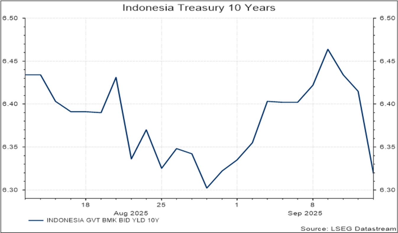 Bank Indonesia (BI) kembali membuat kejutan dengan memangkas suku bunga, melanjutkan kejutan serupa bulan sebelumnya. Selain memangkas suku bunga acuan sebesar 25 bps, BI juga memangkas suku bunga simpanan bank harian (overnight deposit rate) lebih agresif sebesar 50 bps menjadi 3,75%. Langkah ini mendorong bank untuk tidak menyimpan dana berlebih, melainkan menyalurkannya dalam bentuk kredit. Kebijakan BI sejalan dengan langkah Menteri Keuangan Purbaya yang sebelumnya menambah Rp200 triliun likuiditas ke perbankan BUMN, guna mempercepat pertumbuhan ekonomi melalui efek pengganda. Ke depan, BI masih membuka ruang pemangkasan tambahan sebesar 50 bps hingga akhir tahun dan 25 bps lagi pada kuartal pertama tahun depan. Secara keseluruhan, kondisi makro Indonesia tetap stabil, baik dari sisi inflasi maupun nilai tukar Rupiah yang bertahan di kisaran Rp16.200,- hingga Rp16.500,- per dolar AS, meski sudah lebih dulu memangkas suku bunga dibanding The Fed.