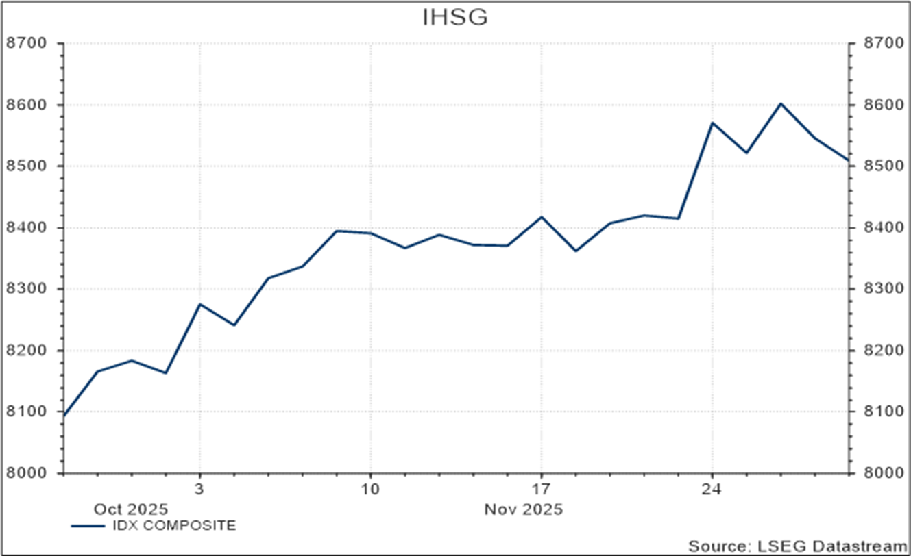Inflasi Indonesia melambat seiring kenaikan harga pangan yang lebih moderat, namun tetap berada dalam kisaran target Bank Indonesia. Kondisi ini memberikan ruang tambahan bagi BI untuk mempertimbangkan langkah kebijakan berikutnya, terutama menunggu keputusan The Fed minggu depan sebelum menentukan arah suku bunga pada pertemuan BI setelahnya. Stabilitas Rupiah tetap menjadi perhatian utama, sementara transmisi penurunan suku bunga sebelumnya terhadap suku bunga kredit masih belum optimal.