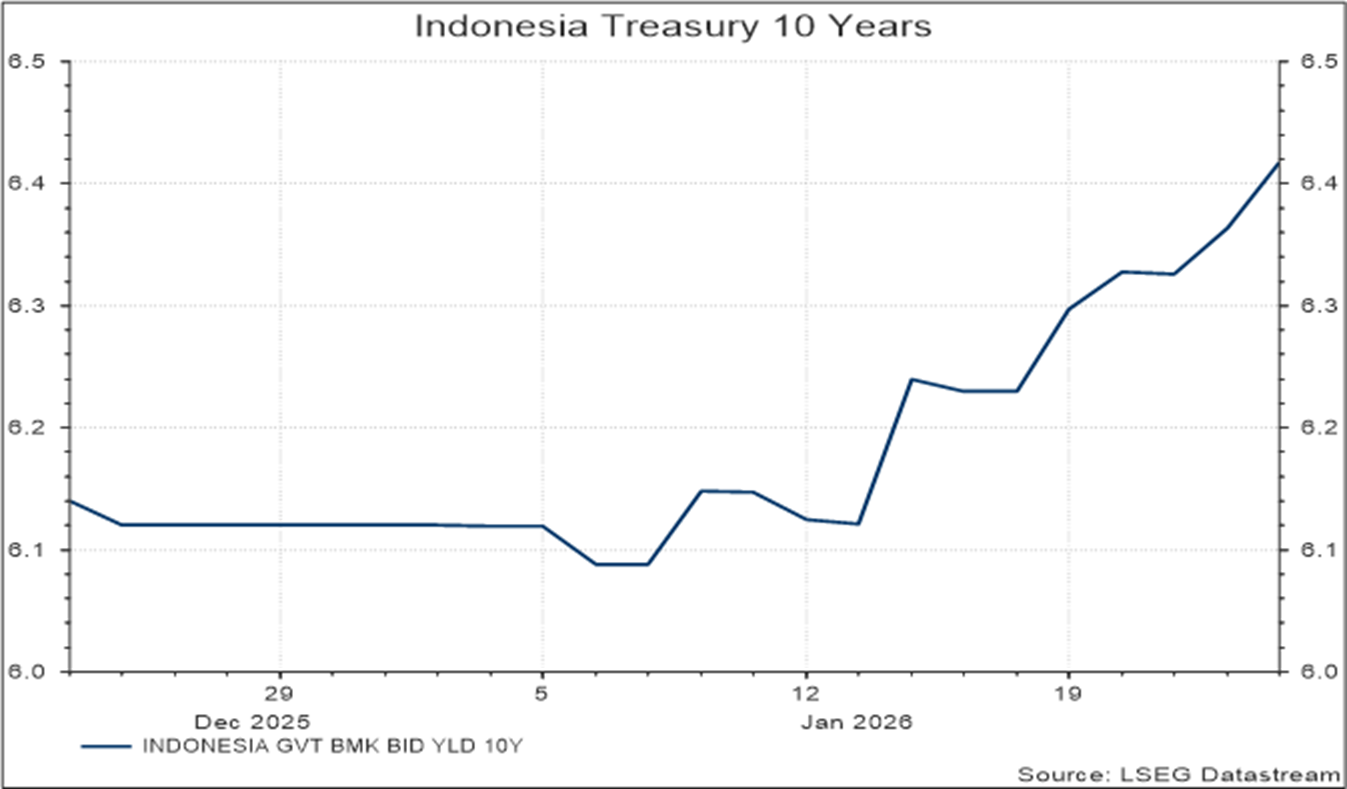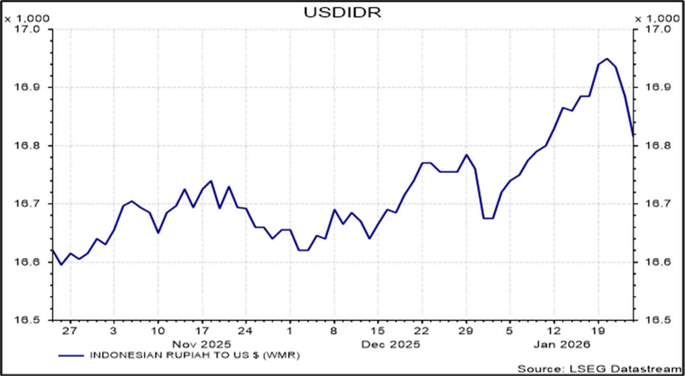 Bank Indonesia memutuskan untuk mempertahankan suku bunga kebijakan sesuai dengan konsensus pasar, dengan fokus utama pada menjaga stabilitas nilai tukar serta mendorong transmisi penurunan suku bunga ke sektor riil. Di tengah meningkatnya risiko geopolitik global, Bank Indonesia mengambil langkah untuk menjaga Rupiah, yang tercatat menguat ke sekitar Rp16.820,- per dolar AS pada penutupan pasar, dibandingkan level terlemahnya di atas Rp16.980,- yang sempat terjadi dalam minggu ini. Konsensus pasar tetap memperkirakan pemangkasan suku bunga sebesar 50 bps hingga akhir tahun.