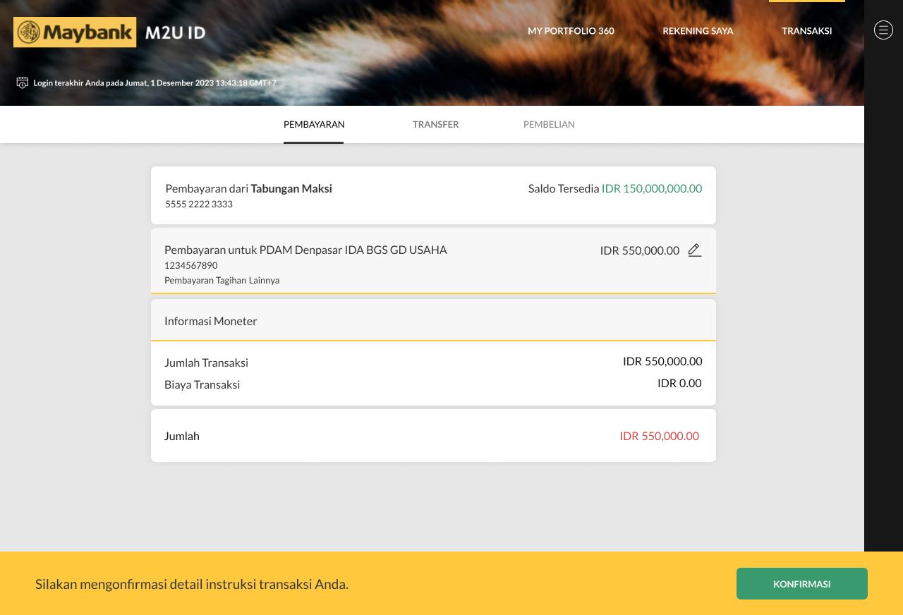 Bayar tagihan listrik (PLN), air (PAM), & telepon atau internet (TelkomPay) dengan mudah dan praktis melalui M2U ID App (mobile banking) atau M2U ID Web (internet banking). Pembayaran jadi lebih tepat waktu, tanpa khawatir adanya denda keterlambatan. Urusan bayar tagihan tinggal #M2UinAja.