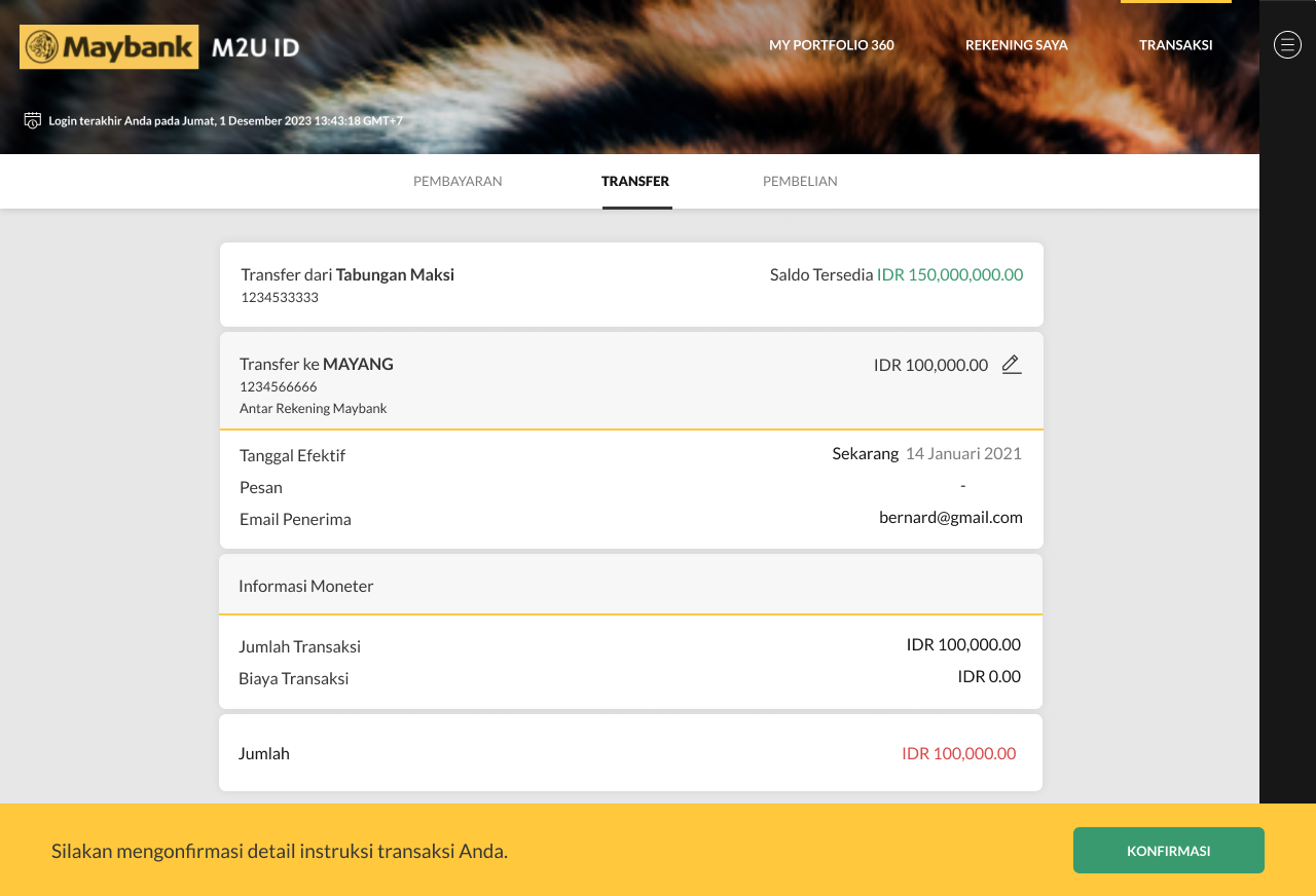 Cek kembali detail transaksi pada M2U ID App, lalu klik ‘Konfirmasi’ jika sudah sesuai.