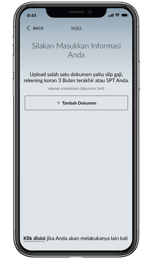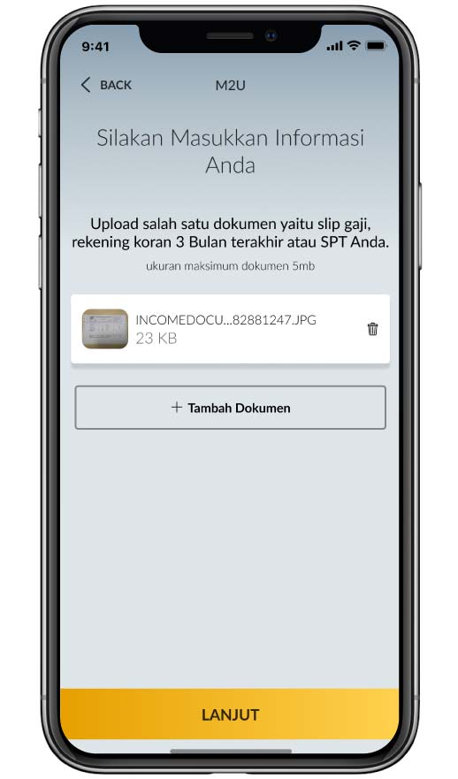 Klik “Tambah Dokumen” kemudian unggah dokumen penghasilan/slip gaji/rekening koran 3 bulan terakhir/STP |